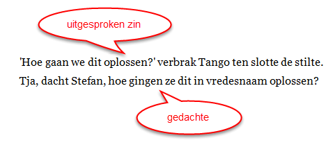 Zinnen die in gedachten worden uitgesproken krijgen bij voorkeur geen aanhalingstekens: